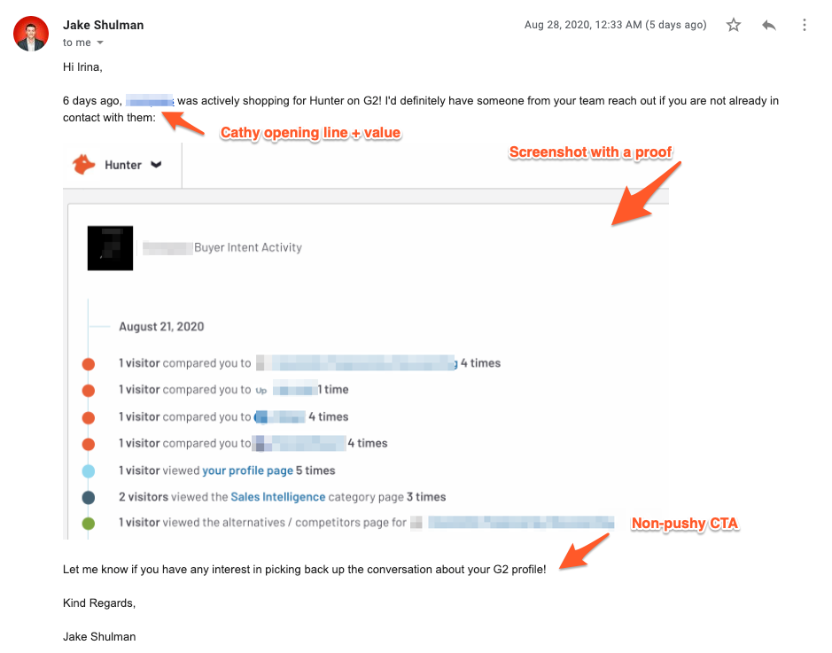 - 他用一个不急于求成的CTA来结束他的cold email(提供继续从G2获得新线索的对话)