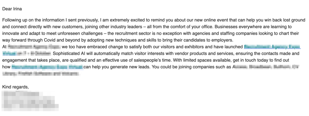 如果你用一些模糊的、沉闷的、没有个性化的东西开头,那么你很有可能永远不会得到潜在客户的回应。
