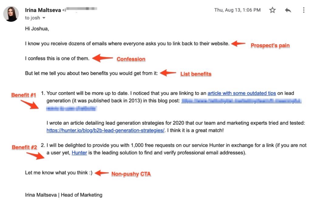 - 提及潜在客户的痛苦(他们收到了很多每个人都要求提供反向链接的邮件);