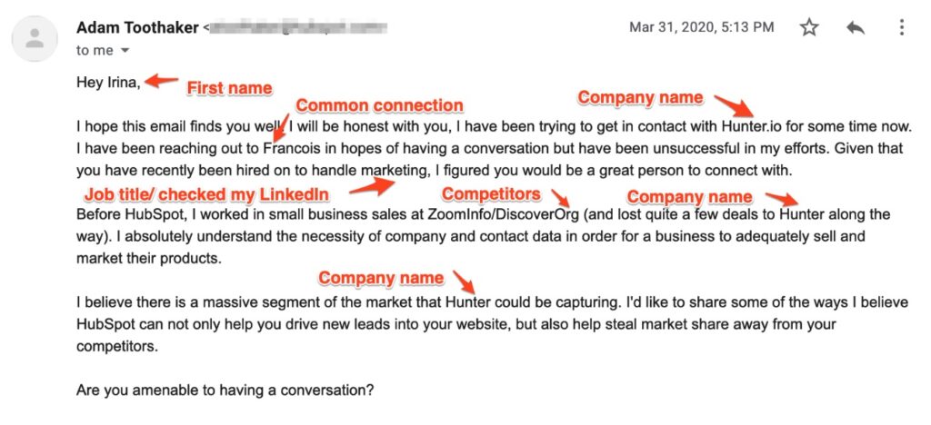 亚当做了很多工作,进行了如此深入的研究,并向我表明他对真正的、互利的商业关系感兴趣。除了包括基本的个性化,他还通过以下方式使邮件变得个性化: